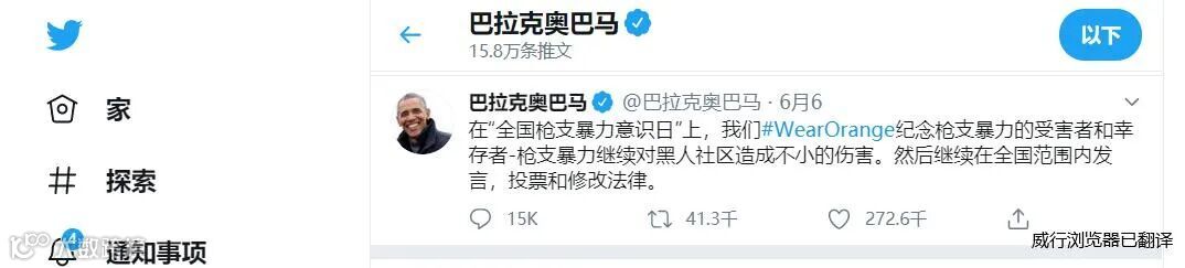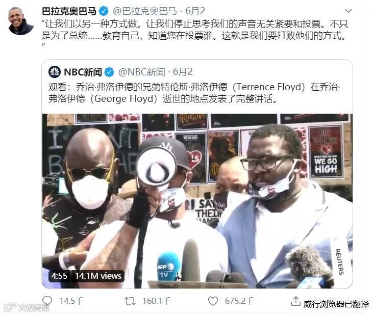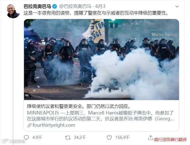前任总统奥巴马作为一个非裔美国人也在推特上针对“暴力执法事件”发言。