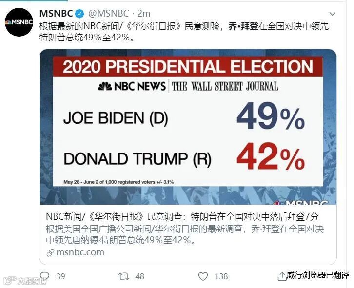 2020年5月8日,《华尔街日报》民意调查,拜登票选49%>特朗普42%。