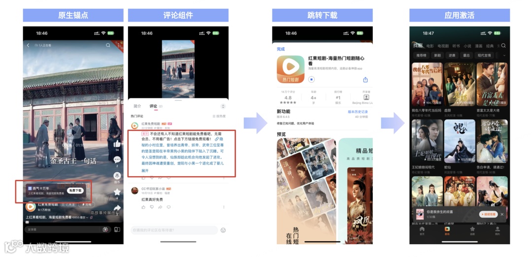 关键优势:链路短且顺滑,iOS与安卓全支持。外层锚点(如“精彩全文在App内”)和评论区组件(如置顶的“点击下载追更全集”)是核心转化入口,需与视频内容强相关,引导明确。