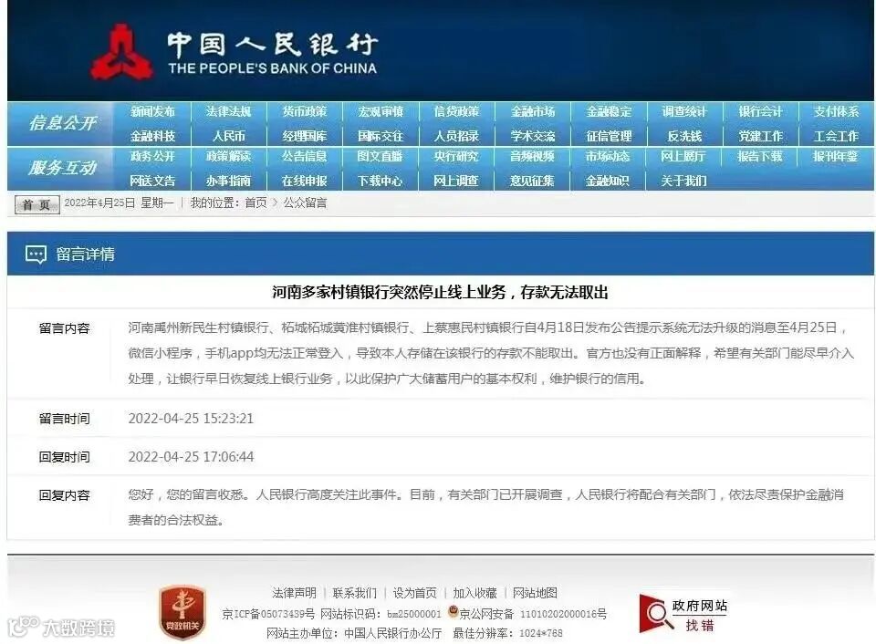 目前央行以及银保监会已经责令当地监管部门加快调查。