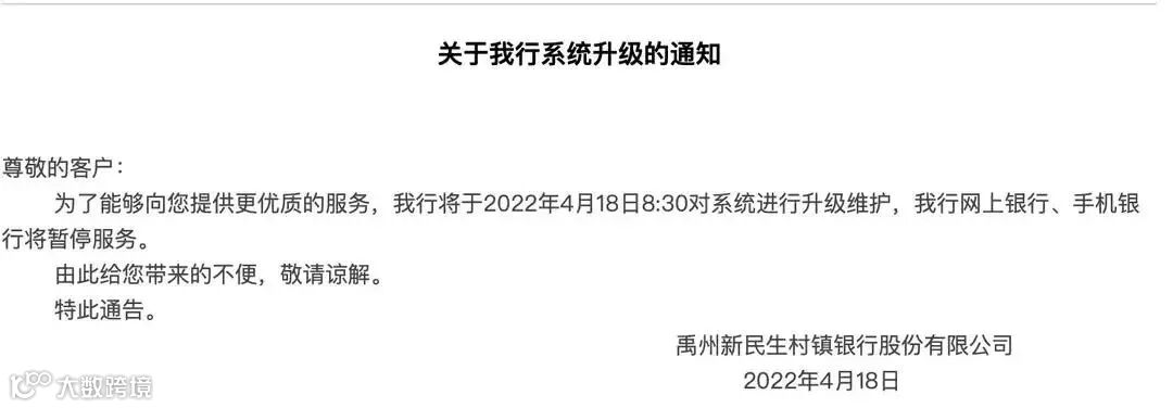 异样开始于4月18日,河南禹州新民生村镇银行、上蔡惠民村镇银行、柘城黄淮村镇等银行先后发布公告,称因系统升级维护,银行的网上银行、手机银行将暂停服务。一些储户急匆匆赶往当地,但同样无法完成提现。
