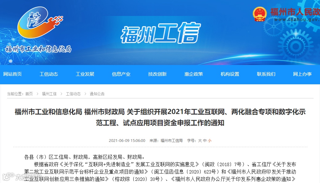 福州市工业和信息化局 福州市财政局 关于组织开展2021年工业互联网、两化融合专项和数字化示范工程、试点应用项目资金申报工作的通知