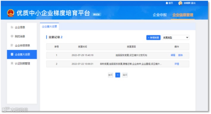 企业在此界面可以进行企业重大变更操作(如下图)。点击【新增变更】,企业可根据情况新增重大信息变更。在变更记录显示界面,企业可以对暂存的数据进行【编辑】、【删除】操作;点击【详情】可以查看企业提交的数据的详细信息。根据【变更类型】,可以查询企业的历史变更记录。