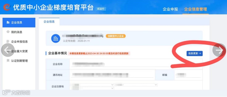 点击【企业信息管理】--【企业信息】--选择右上角的【信息更新】,根据企业实际情况对内容进行更新。