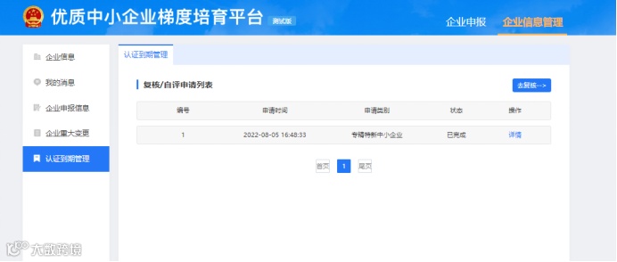 企业可以在【认证到期管理】页面提交复核申请。未认定的企业不提供复核功能,满足复核条件的企业点击【去复核】,可以进行复核申请。该界面可以查询企业的历史复核记录,对已提交复核的记录可以进行【详情】操作。