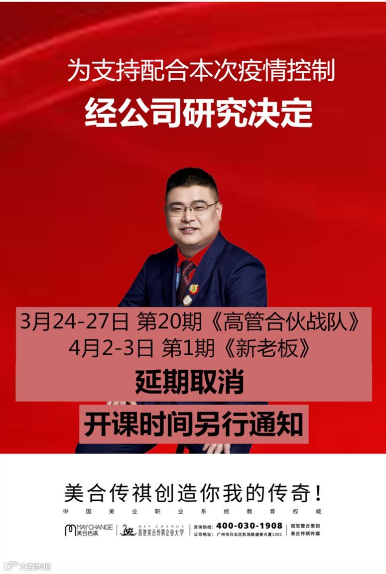 因此,我司响应国家要求,原定3月24-27日在井冈山开展的课程:第20期《高管合伙战队》,原定4月2-3日在广州开展的课程《新老板》双线经营系统决定: