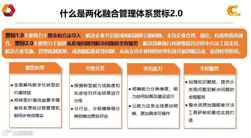 相对于两化融合管理体系贯标1.0,贯标2.0主要致力于提出发现问题到解决问题的全程服务,从聚焦转型、分级分类、突出能力、全程服务四个方面,解决具体执行和逐级提升过程中方法工具支持、解决方案实施、管理机制落地、成效跟踪优化等问题,从而支持企业获取数字化转型的价值和效益。