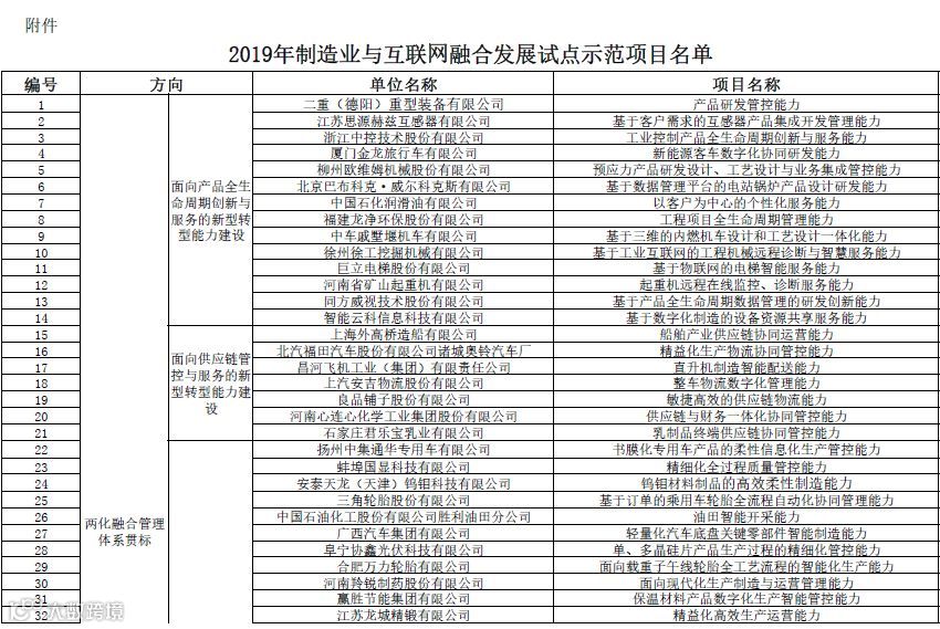 近日工信部发布了《2019年制造业与互联网融合发展试点示范项目名单公示》,拟将产品研发管控能力等137个项目核定为2019年制造业与互联网融合发展试点示范项目,并进行公示,公示时间为2019年11月5日至2019年11月12日。