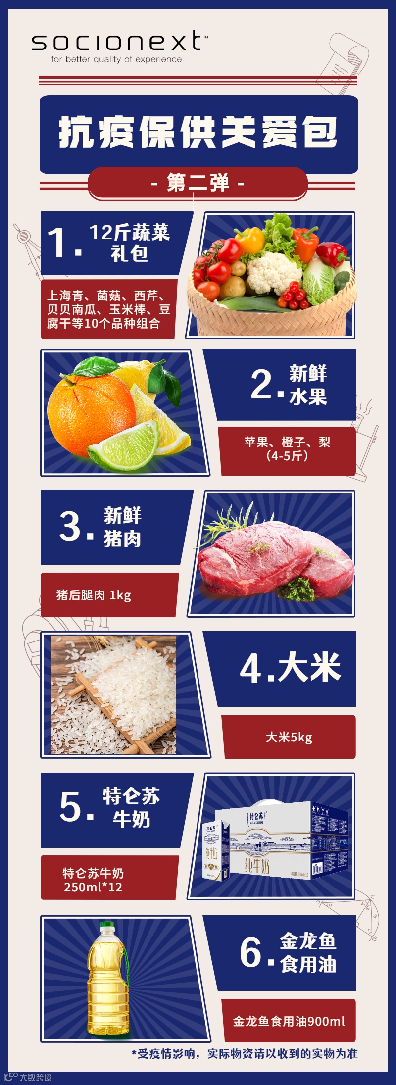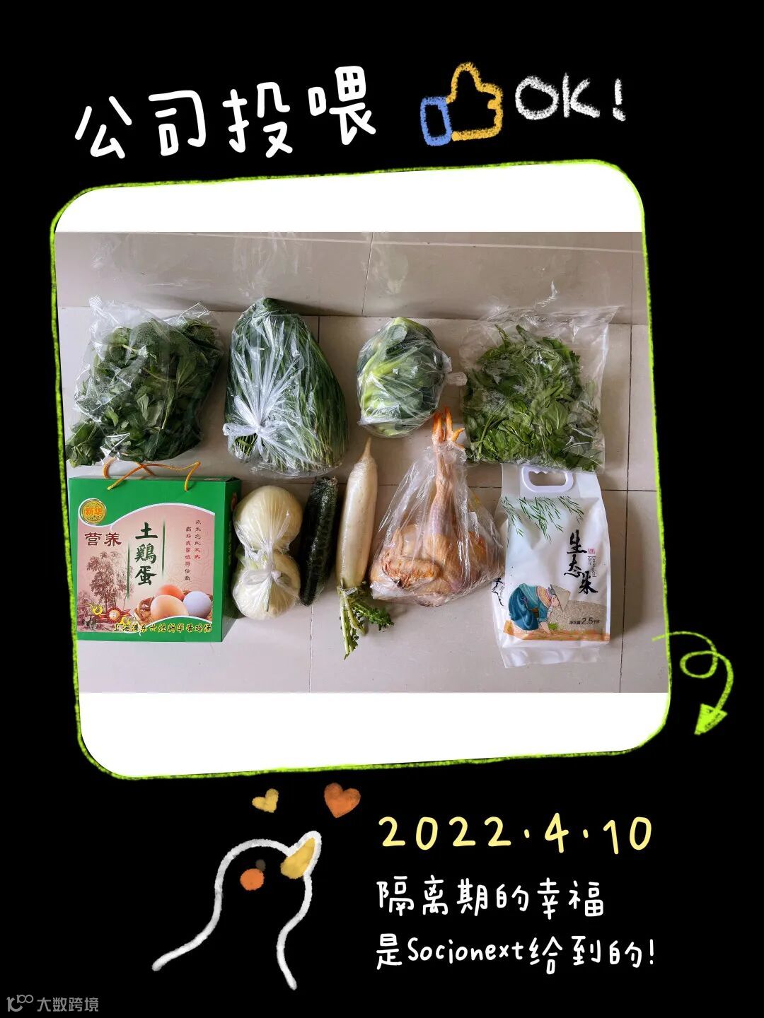 还记得上周Socionext给所有上海员工送了一波抗疫保供关爱包吗?关爱包一不小心被刷爆了朋友圈。员工和家属们纷纷点赞,都说关爱包种类丰富,而且在2天时间内为员工点对点送菜上门,很多同事表示库存一下子充足了。