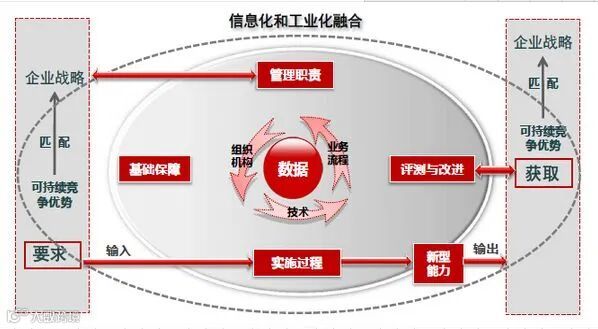 为此,要将与组织战略匹配的可持续竞争优势对打造信息化环境下新型能力的要求,作为两化融合管理体系的输入;将通过两化融合所形成的信息化环境下的新型能力,作为两化融合管理体系的输出;通过两化融合管理体系所规定的相关过程,来明确组织打造新型能力的路径和方法;通过准确界定两化融合管理体系输入并评价输出对于可持续竞争优势获取的符合性,来确保和提升两化融合管理体系的有效性,确保组织持续提升核心竞争能力。