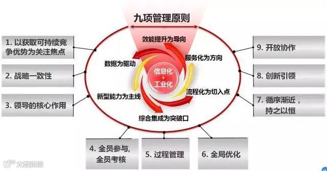 ③管理循环(策划—支持、实施与运行—评测—改进):围绕数据、技术、业务流程与组织结构四要素,充分发挥领导的核心作用,建立策划,支持、实施与运行,评测与改进管理机制,规范两化融合过程,推动新型能力的螺旋式提升,稳定获取预期的竞争优势。