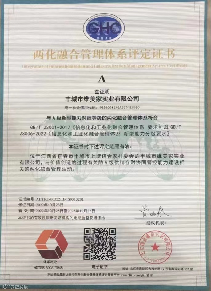 生活用纸是生活中不可或缺的必需品之一,我国生活用纸行业企业数量众多,竞争日益激烈。作为丰城市重点发展企业,维美家实业有限公司拥有丰富的纸品制造经验,积极引进先进的生产设备,加快转变发展方式,打造品牌化、创意化、绿色化、信息化企业模式,并于2022年导入两化融合管理体系,获取可持续竞争优势需求,打造新型能力,实现产业转型升级,推动可持续发展。