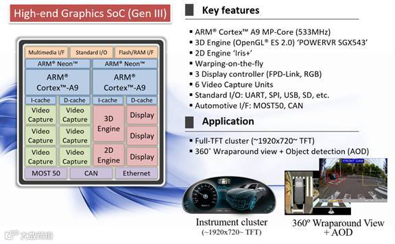 Triton是GDC SoC产品线的第三代产品,具备双核Cortex A9,3D引擎已升级到了POWERVR系统,2D引擎运用 Iris+,Warping-on-the-fly 功能可以用于抬头显示及部分的屈光矫正。其拥有三路的Display输出及6路视频输入功能,可以同时接收6路摄像头的输入。