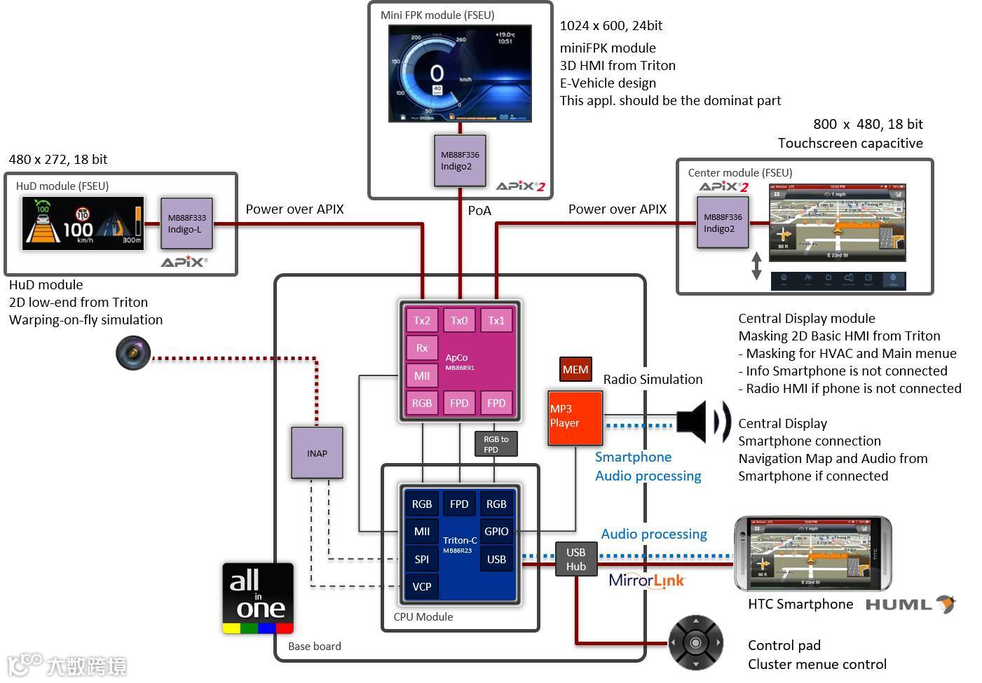 All-in-One是索喜科技提出来的数字一体化系统概念,该产品具有低成本、高性能的系统架构,符合现代市场需求。All-in-On集合了我司旗下GDC(Graphics Display Controller)产品线的数个主要产品。由一个大屏的虚拟液晶仪表、抬头显示及一个中控娱乐导航系统组成。通过APIX®技术传递图像信息,三个显示器完全独立运行。