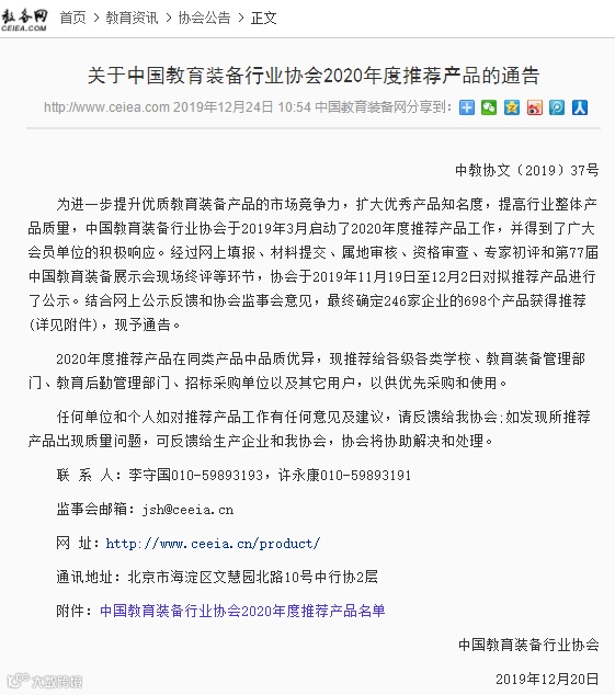12月24日,经过资格审查、专家初评和第77届中国教育装备展示会现场终评等环节,中国教育装备行业协会2020年度推荐产品名单公布,欧帝智慧教室互动黑板名列其中!
