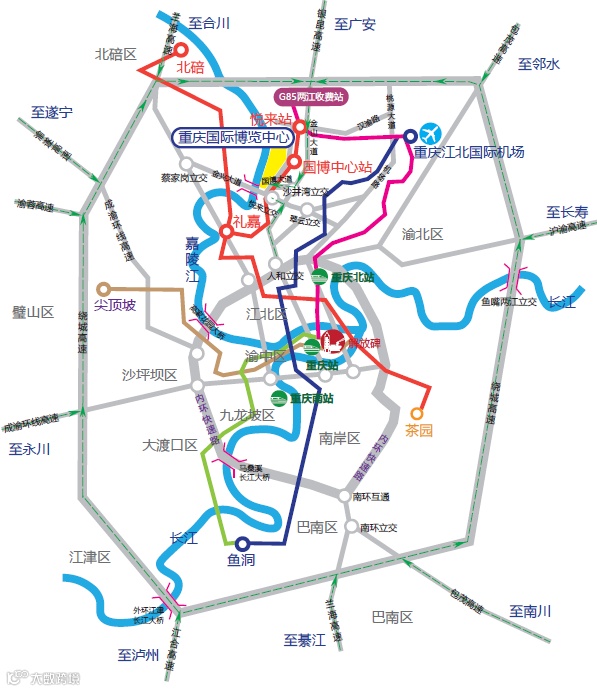 ①乘坐轨道交通10号线,重庆北站北广场站上车(王家庄方向)→悦来站下车(站内换乘)→乘坐轻轨6号线(开往礼嘉方向)→国博中心站下车(3号出口),全程约50分钟。