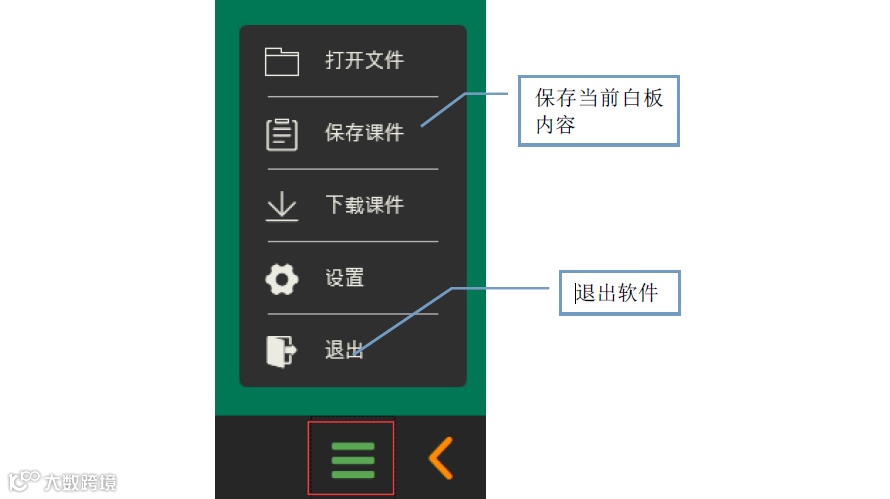 点击图示红色区域,打开“文 件”即可浏览框选择需要的件,打开的文将会保留图标在白板中 (课件除外) 。