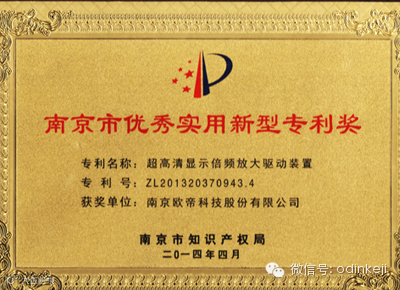 我司前期申请的实用新型专利(超高清显示倍频放大驱动装置——ZL201320370943.4),喜获南京市优秀专利奖荣誉称号。这一奖项肯定了我司在4K大屏显示器领域科技创新工作,进一步增强了我司在广告机、触摸一体机、监视器的市场竞争力,同时为提升客户服务、树立品牌形象,提供更加有力的保障。