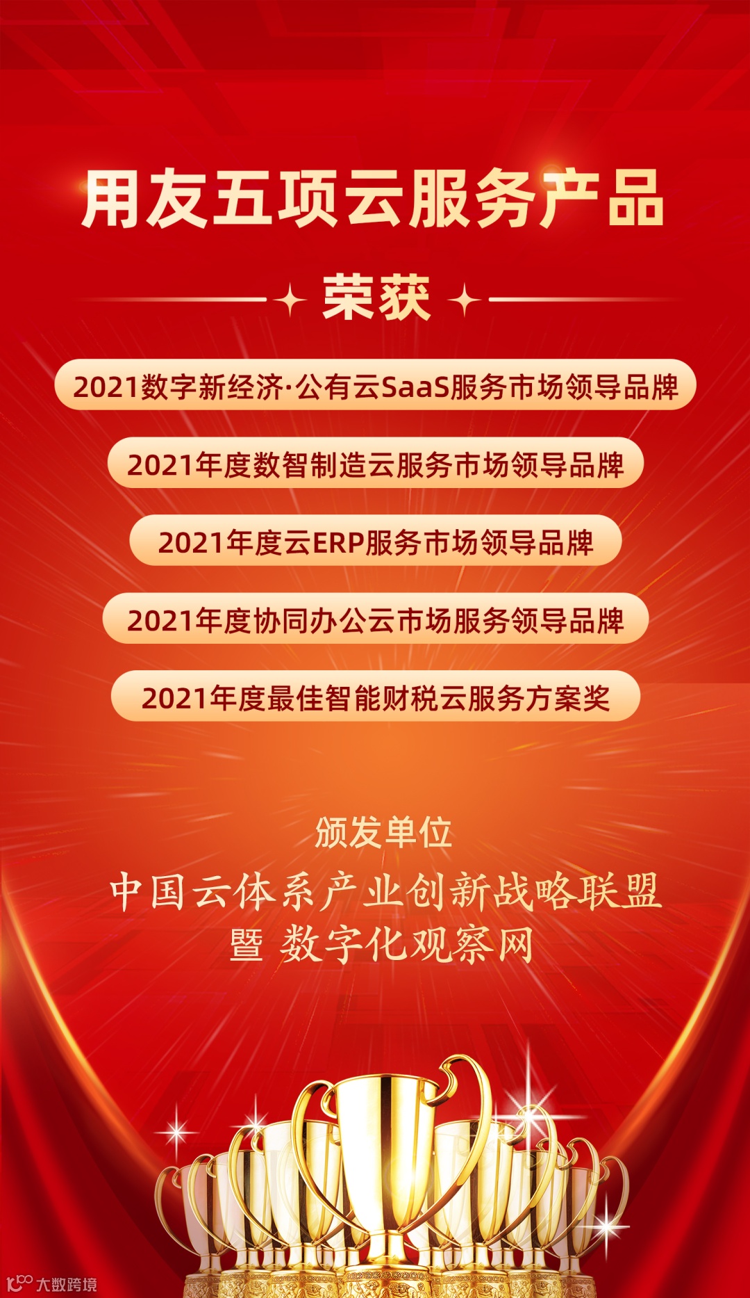 2021年11月30日,用友五项云服务荣获“数字中国•云领未来”(第三届)2021数字新基建 ·中国云体系产业年度评选领导品牌及最佳云服务方案奖。