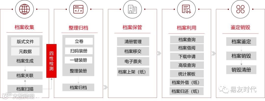 多方式支持影像件采集、实现自动装册&自动归档&自动上架、支持档案多维度检索、严格档案管理查阅&借阅&移交等、建立电子会计档案与纸质档案索引、能实现纸质档案反向查找电子会计档案。