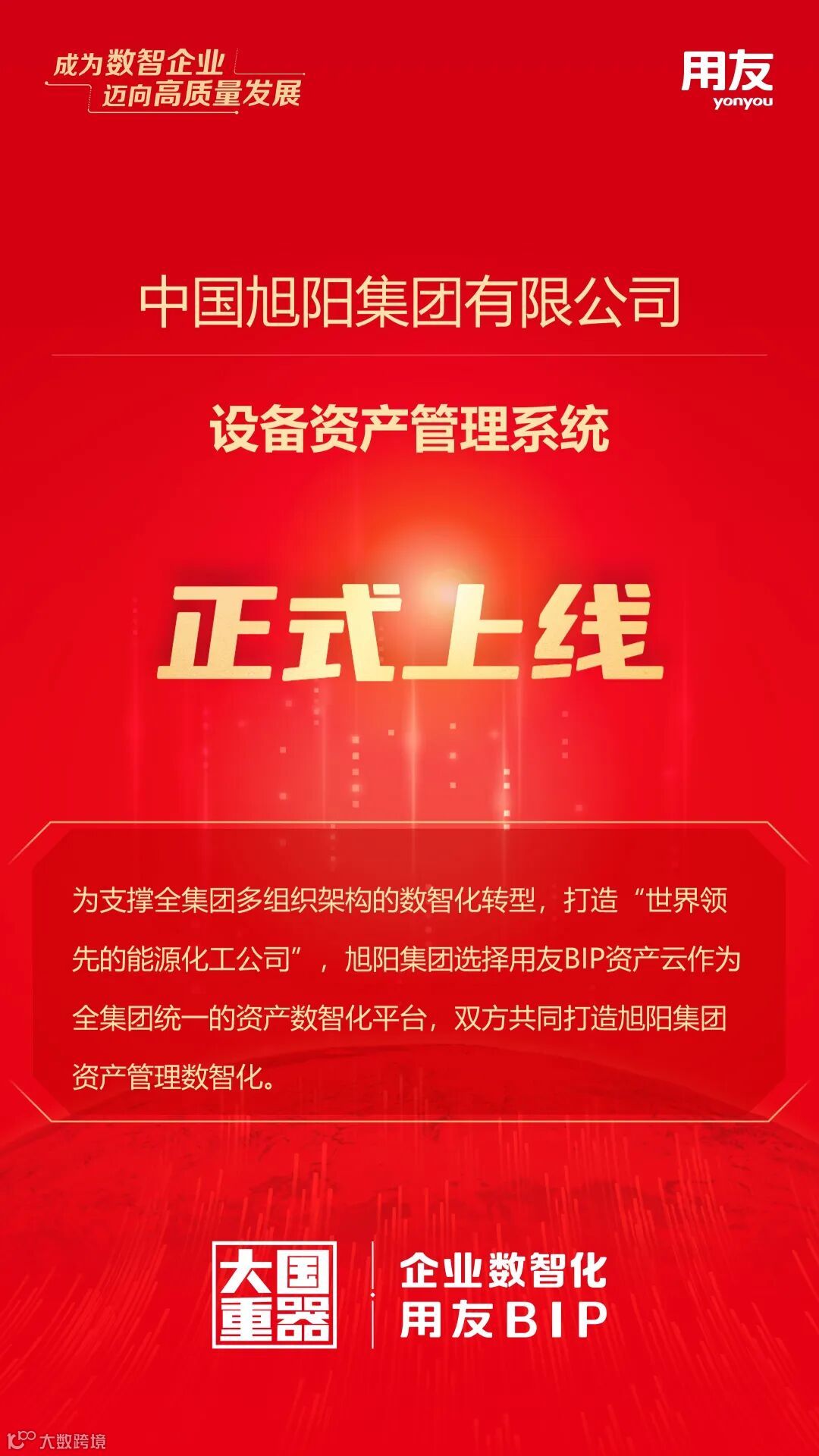 近日,中国旭阳集团设备资产管理系统正式上线,作为中国500强企业,旭阳集团体系庞大,为了能够支撑全集团多组织架构的数智化转型,打造“世界领先的能源化工公司”,旭阳集团选择用友BIP资产云作为全集团统一的资产数智化平台,双方共同打造旭阳集团资产管理数智化。
