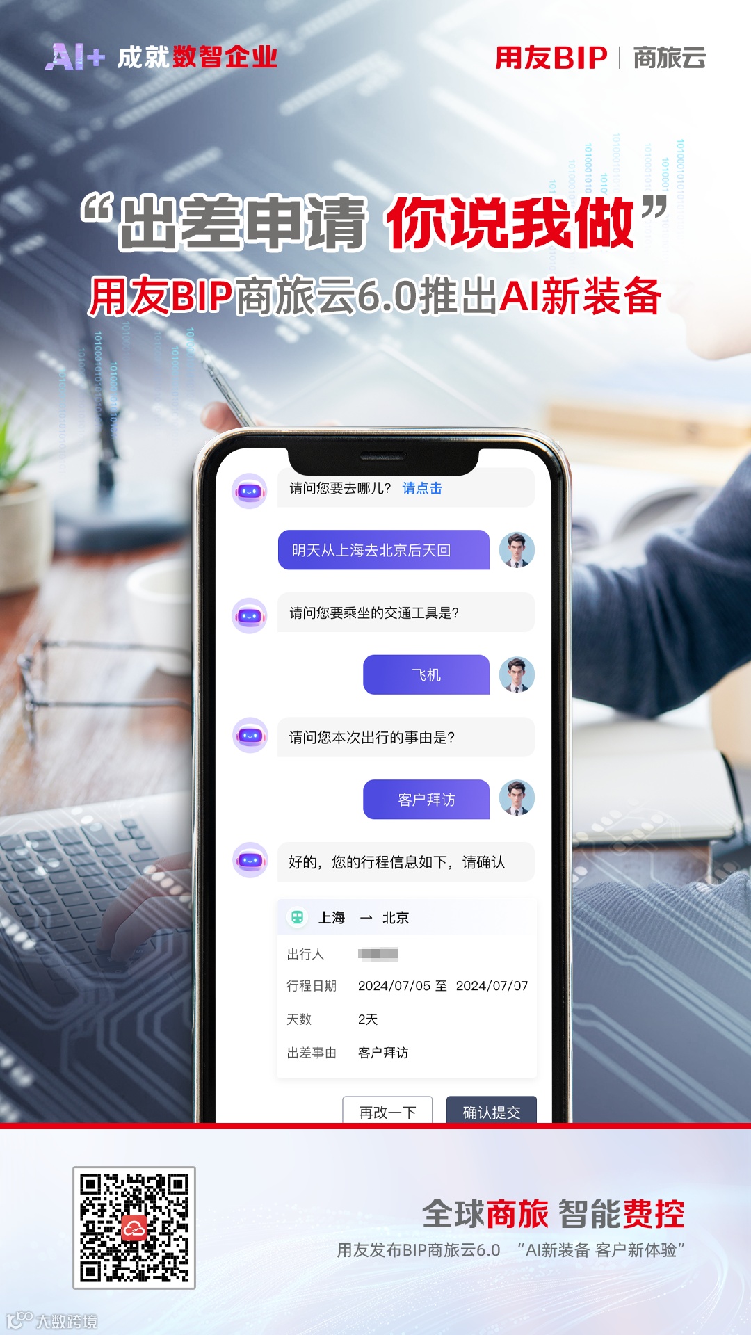 用友BIP商旅云6.0引入了先进的语音识别与自然语言处理技术,通过人机互动的方式大大简化了出差申请的填报过程。员工只需通过简单的语音指令或文字输入,系统即可自动完成信息的录入与整理,避免了手动填写的繁琐与错误。