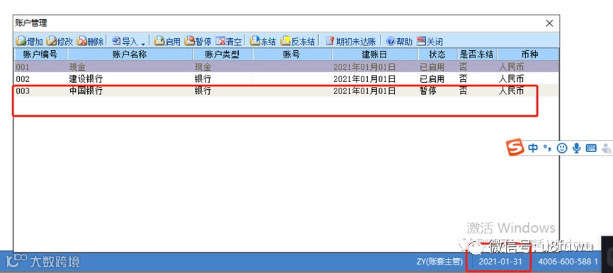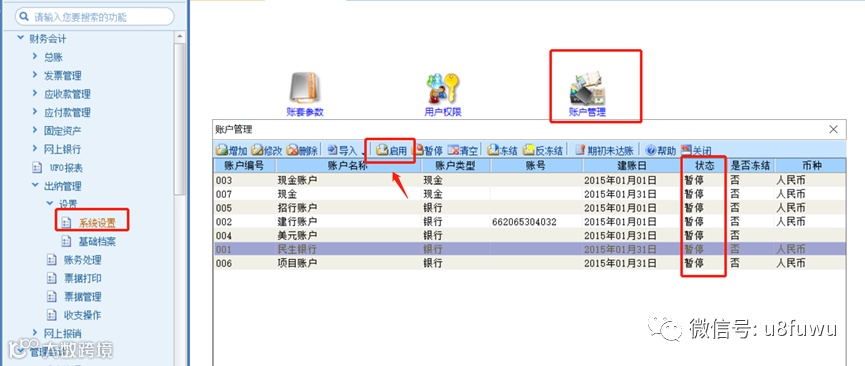 新年度结转后,账户默认是暂停的,需要手工启用。