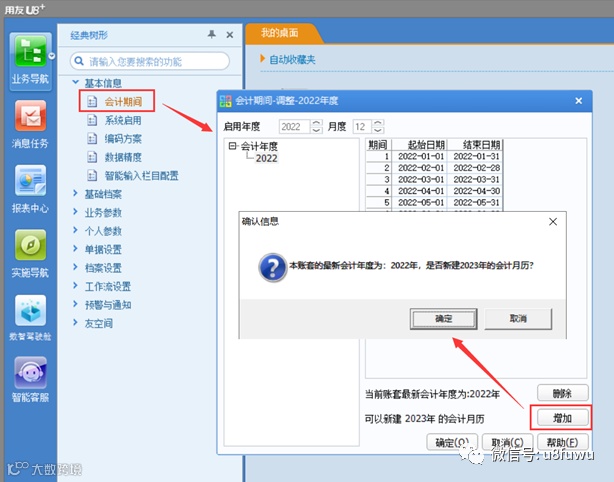 方法二:使用账套主管登陆企业应用平台,在基础设置——基本信息——会计期间——增加,可手工增加下一年度的会计期间