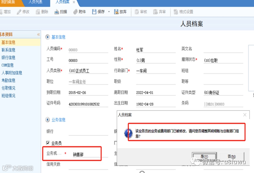 4.修改人员档案中的业务或费用部门为新部门,系统弹出提示时选择否。
