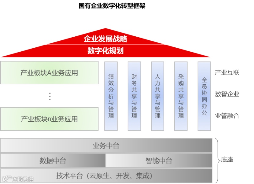 1、顶层设计缺少全局性,“前瞻性战略”是关键:大型国企规模大,下属企业众多,目前部分国企的数字化转型依然停留在部分部门或者业务,在顶层设计缺少全局性。
