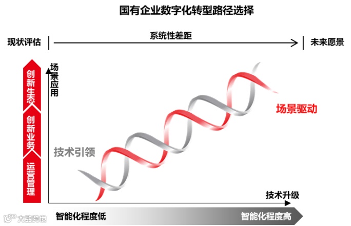 可以看出国有企业数字化转型并非单一的技术革新,同样也是管理的升级。既要保证技术的适用性,也要实现场景的创新性。在转型过程中,技术引领与场景驱动两条典型路径缺一不可,两种路径呈现双螺旋式平行结构,彼此之间互相作用和影响。
