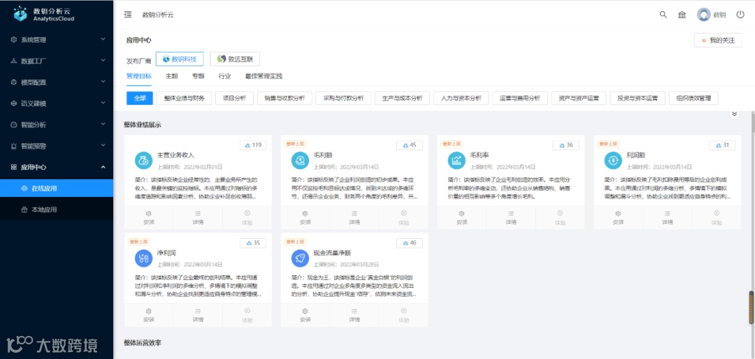数钥分析云—ERP数智伴侣,是数钥科技的数据服务产品,完整的BI平台提供技术支撑,基于自主研发设计的企业管理数据仓库标准和模型应用标准,向客户提供一套从场景触发、洞察分析、解决指引、行动指挥、结果评估五个阶段的管理场景闭环产品解决方案,直击企业管理痛点,提升企业管理价值,解决企业开发数据分析体系的难度,全面重现企业商业逻辑与机制创造。