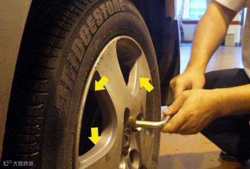 别一上来就把千斤顶先弄上,一定先要用螺丝扳手送送螺丝(是拧松,不是卸下!),注意,在松螺丝的时候,要采取对角线逐个拧松的方法,因为这样才不会使得螺丝、轮胎、轮毂变型!