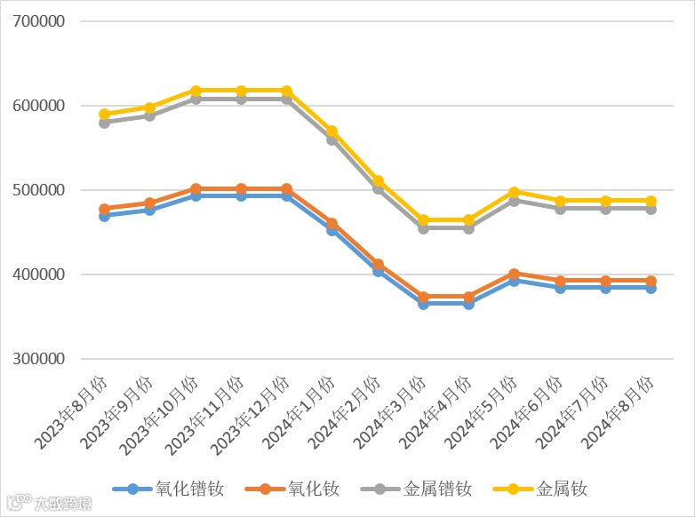 表1 轻稀土系列2023年8月-2024年8月份挂牌价格 元/吨