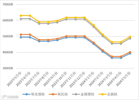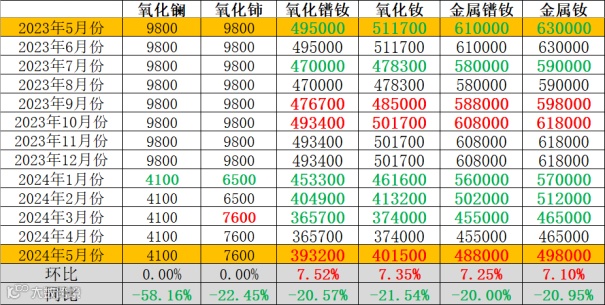 与2023年5月同期相比,氧化镧、氧化铈同比下降,降幅分别为58.16%、22.45%;镨钕系金属及其氧化物价格同比下降,氧化镨钕、氧化钕、金属镨钕、金属钕同比降幅分别为20.57%、21.54%、20.00%、20.95%。