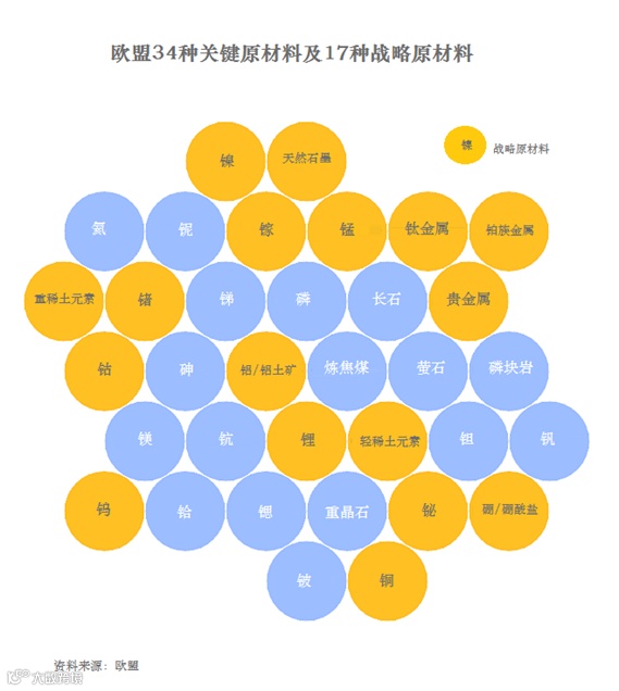 3月份,为提高清洁技术产品的竞争力,欧盟委员会提出了《关键原材料法案》。该法案提出,欧盟2030年所需16种关键原材料的年供应量中10%应该来自本土开采,15%来自再生,40%来自本土加工。法案强调,稀土、锂、钴、铜、镁和钛等任何一种战略原材料对任何一个第三方国家的依赖度不能超过65%。