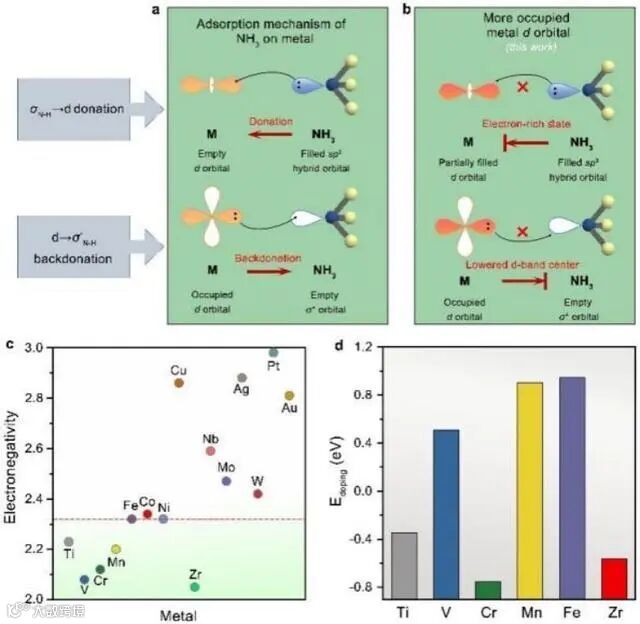 通常,过渡金属结合氨的能力与其未占据和占据的d轨道相关,其既可接受来自氨的电子也能向氨反向供给电子,两者都能增强氨的吸附。钼镍合金是高效氢氧化催化剂,研究人员认为营造镍位点的富电子态会排斥氨的孤对电子供给,而引入比镍电负性小的元素可以提供电子获得镍的富电子态。研究人员发现,将Cr掺杂入钼镍合金不仅获得镍的富电子态来抑制σN-H→dmetal电子供给,同时还使d带中心下移阻隔了d→σ*N-H的反向电子供给,两者协同作用大大削弱了氨吸附。