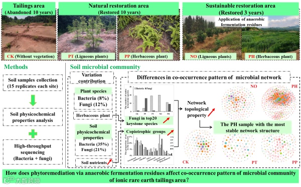 针对稀土尾矿地土壤酸化沙化严重、土壤养分贫瘠及微生态功能丧失等问题,中国科学院广州能源研究所生物质能生化转化研究室以适宜当地气候的能源植物为修复植物,建立了“能源植物种植-土壤生态修复-厌氧发酵制气-沼液回施/沼渣高值利用”为核心的生态能源农场修复模式。研究发现,在可持续修复区,采用沼液施用草本类能源植物可在3年内显著提升稀土尾矿地的土壤养分及微生物多样性,初步恢复土地生产力,相关指标优于自然修复区的土壤样品。非度量多维尺度(NMDS)分析表明土壤微生物群落的变异主要受到土壤理化性质变化和修复植物种类差异的影响;方差分解分析(VPA)发现土壤养分是影响细菌和真菌群落变异的关键因子,且细菌群落对土壤养分变化的响应快于真菌群落。此外,土壤养分提升明显改变了寡营养和富营养微生物的比例,其中,富营养型微生物变形杆菌门、拟杆菌门、芽单胞菌门和球囊菌门显著增加。微生物互作网络分析进一步显示,富营养型微生物增加可提高微生物互作网络拓扑特性,增强其网络稳定性;来自变形杆菌门(细菌)和子囊菌门(Ascomycota,真菌)等富营养型微生物的菌株已成为构建稳定网络结构的主要关键物种。此外,以草本类植物为修复植物还可增加子囊菌门在互作网络中的比例,并与细菌协同提高互作网络的拓扑特性。