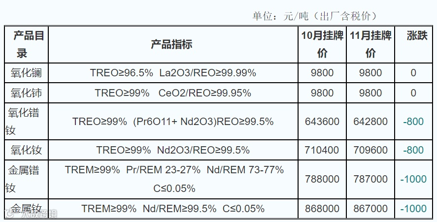 北方稀土高科技股份有限公司发布2022年11月稀土产品挂牌价格
