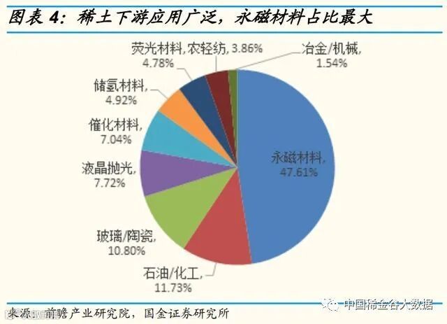 下游:永磁材料、石油化工和陶瓷玻璃是稀土的主要应用范围。稀土元素具有特殊的物质结构,其光、电、磁、超导、催化等物理性能优 异,既可广泛应用在玻璃、陶瓷和石化等传统领域,也可应用于永磁 材料、发光材料、催化材料、储氢材料和高温超导等高新技术领域。在具体用量方面,镧、铈、镨和钕等轻稀土元素为应用领域最广、用量最多的稀土元素;钐、铕、钆、铽、镝和钇等重稀土元素虽然从用量上占比不大,却是高科技领域不可或缺的添加剂。