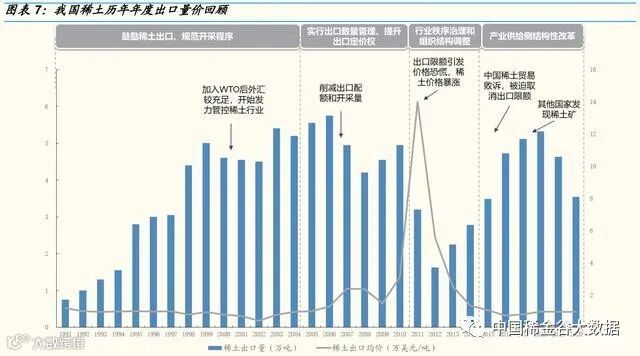 出口政策是我国稀土管理政策体系的重要组成部分,其政策工具有两个, 一是出口关税,二是出口配额。回顾我国出口政策改革的几个阶段: