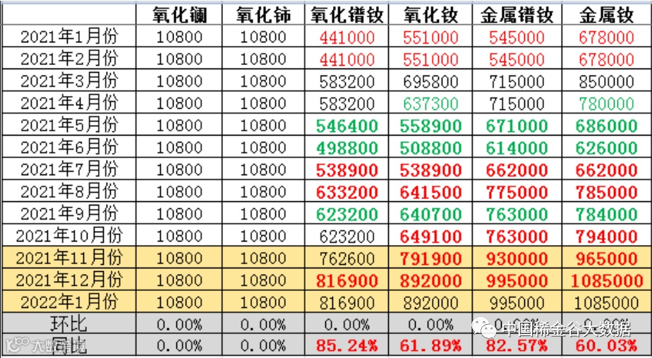 表2 轻稀土系列2021年1月-2022年1月份挂牌价格 元/吨