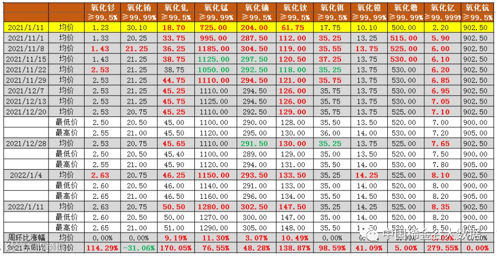 同比分析:与2021年1月11 日同比,11种氧化物只有氧化铕价格下降,氧化钪价格不变,其它氧化物价格均同比上涨,涨幅超过100%的有氧化钐、氧化钆、氧化钬、氧化钇。
