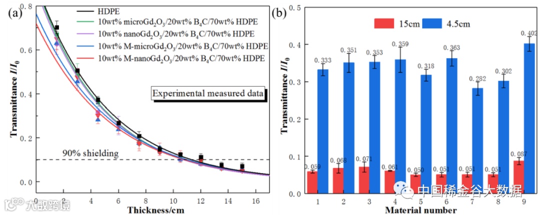 图1 (a)纳米/微米复合材料和改性纳米/微米复合材料的中子透射率对比,(b)多种复合材料在4.5 cm和15 cm厚度时的中子透射率对比