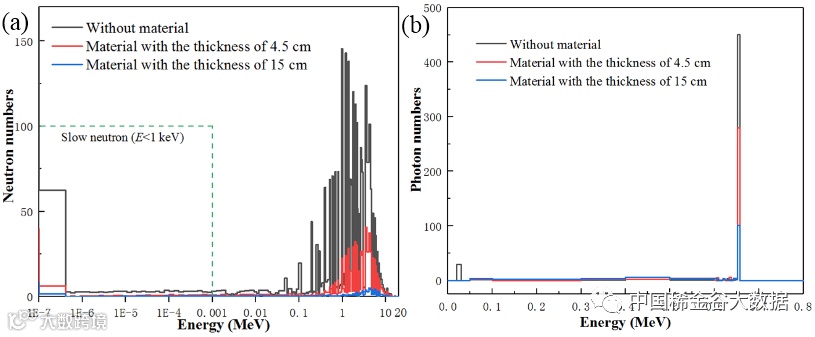 图2 探测器面处的(a)Cf-252中子能谱和(b)Cs-137伽马能谱 (黑线:未加载复合材料, 红线:加载4.5 cm厚度复合材料, 蓝线:加载15 cm厚度复合材料)
