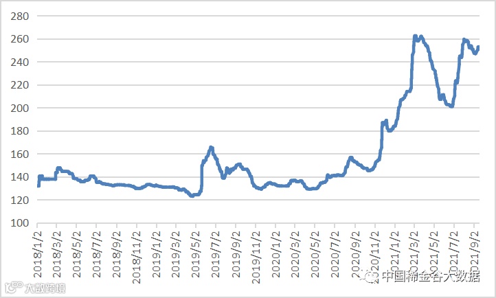 图1 镨钕系轻稀土挂牌价格走势图(201908-202108)