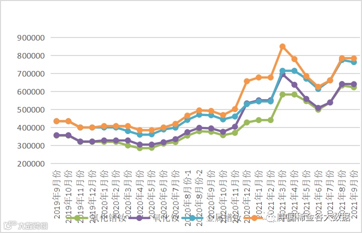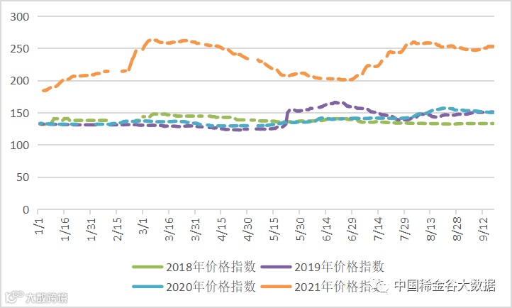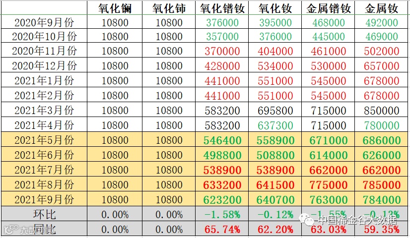与2020年9月同期相比,氧化镧、氧化铈同比不变;镨钕系金属及其氧化物价格同比大幅上涨,涨幅与上月相比,幅度变化不大。氧化镨钕、氧化钕、金属镨钕、金属钕同比涨幅变化分别为67%→66%、61%→62%、65%→63%、59%→59%。