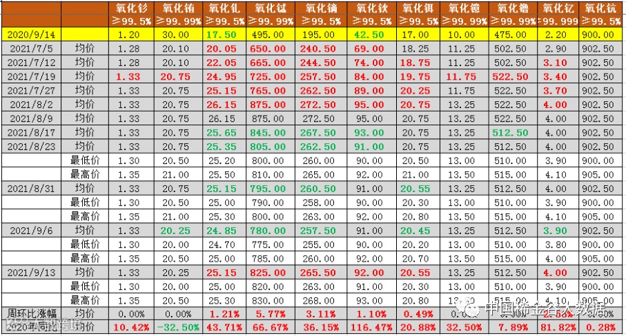 与2020年9月14日挂牌价同比分析,氧化铕同比下降(降幅30.8%→32.5%,降幅与上期相比,不变),其它10种氧化物均同比上涨。