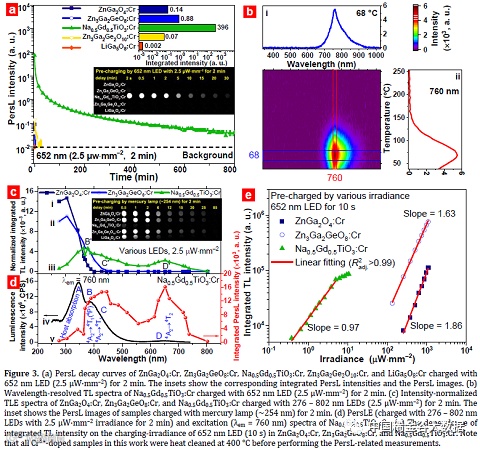 广东省科学院稀有所稀土发光材料林利添博士团队联合暨南大学和中山大学团队,研究出一种新型钙钛矿结构稀土基近红外长余辉发光材料Na0.5Gd0.5TiO3:Cr3+。该材料在低照度(~2.5 μW·mm–2)的红光(~650 nm)充能后,其所获得的余辉强度(~760 nm)达到主流近红外长余辉发光材料的100倍左右。在此基础上,通过实验与所构建的基质相对能级图(HRBE),提出了一种新的单光子充能机理,并在原位模拟(SNR~120)和小鼠体内(SNR~35)实现高信噪比的近红外成像,该成果为发展新型稀土基近红外长余辉发光材料和发光机理提供了新的启发。
