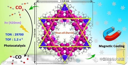 近日,在郑彦臻教授指导下,西安交通大学前沿院博士后陈伟鹏采用“混合配体”策略,在溶剂热条件下成功的制备出一例高核过渡-稀土混金属纳米团簇—{Ni36Gd102}。该团簇分子拥有六芒星状的形状,为目前报道的第二大3d-4f混金属团簇,并具有良好的溶液稳定性。因团簇金属镍离子存在潜在的空余配位点,因此该化合物可以选择性地在可见光下催化还原CO2为CO(90.2%),其TON为29700、转换频率为1.2 s−1,超过了多数同类型的催化剂。而该团簇含有的大量稀土钆元素也使得该分子材料在2K 和ΔH = 7 T时产生了41.3 J·kg–1·K–1的磁熵变,在低温磁制冷方面具有较好的应用潜力。与此同时,我们利用周期性密度泛函理论及循环伏安法对催化机理予以解释。该工作不仅为3d-4f混金属团簇的设计合成提供了新的思路,同时也将为稀土基纳米团簇的溶液稳定性、催化性能的探究及功能拓展提供了借鉴与理论依据。